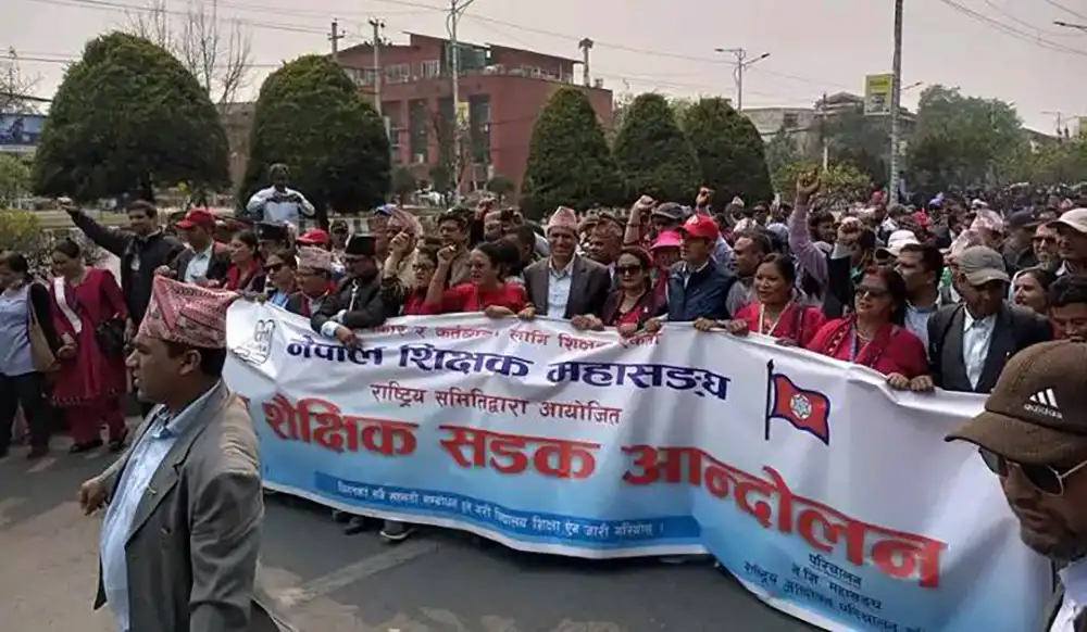 काठमाडौँ : नेपाल शिक्षक महासङ्घले विभिन्न माग राख्दै सुरु गरेको आन्दोलन आज पनि जारी छ । आज शिक्षकहरु बबरमहल–बानेश्वर सडकमा भेला भएर सिठ्ठी बजाउँदै शान्तिपूर्ण तरिकाले आफ्ना माग सरकारको ध्यानाकर्षण गराइरहेका छन् । गुणस्तरीय शिक्षा, विद्यार्थी र शिक्षक–कर्मचारीमैत्री विद्यालय शिक्षा ऐन जारी माग गर्दै शिक्षकहरु यही चैत २० गतेदेखि आन्दोलित छन् । नेपाल शिक्षक महासङ्घका अध्यक्ष लक्ष्मीकिशोर सुवेदीले नेपालमा गुणस्तरीय विद्यालय शिक्षाका लागि विद्यालय शिक्षा ऐन जारी नभएसम्म आन्दोलन जारी रहने बताउनभुयो । महाङ्सघले आज विज्ञप्ति जारी गरी यो अवधिमा उत्तर पुस्तिका परीक्षण, नतिजा प्रकाशन, तालिम गोष्ठी, सेमिनार, शैक्षिक भ्रमणजस्ता कुनै पनि काममा संलग्न नहुन सबै शिक्षकहरुलाई आग्रह गरेको छ ।