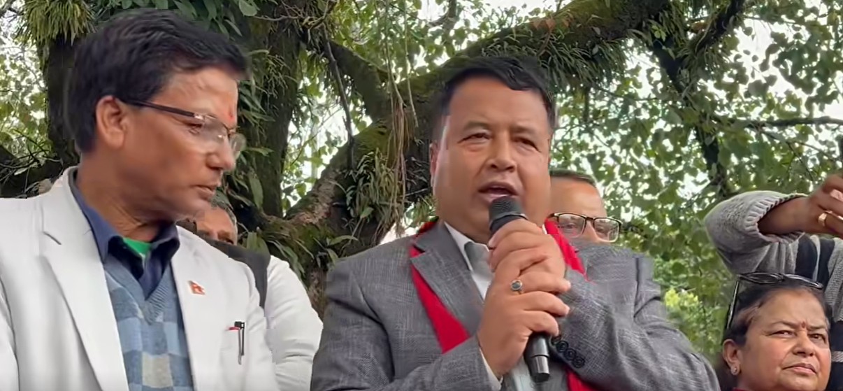 ‘यदि प्रहरी र सरकारले नियन्त्रणमा लिएन भने राष्ट्रिय युवा संघ नेपालले माइतीघरमा घेर्ने छ र ठिक पार्ने छ, राष्ट्रिय युवा संघ नेपालले माइतीघरबाट गिरफ्तार गर्ने छ र प्रहरीलाई बुझाउने छ’, उनले भने । घरमा बम हान्ने, आक्रमण गर्ने र मार्ने धम्की दिइन्छ र गृहमन्त्री मूकदर्शक बन्छन् भने आफ्नो सुरक्षा आफैले गर्नुपर्ने स्थिति आउने उनले बताए । उनले त्यो स्थिति आउन नदिन सरकारलाई सचेत गराए । एमालेको महाधिवेशन पोखरामा हुन लागेको बताउँदै उनले पोखरा महाधिवेशनले फेरि केपी ओलीलाई एमालेको अध्यक्ष बनाउने प्रष्ट पारे । ‘त्यो महाधिवेशनबाट हामी फेरि केपी ओलीलाई कास्कीबाट पार्टी अध्यक्ष बनाउने छौँ, किनभने केपी ओली राष्ट्रियताको नेता हो, केपी ओली हाम्रो सिमाना मिचिँदा संसारभरि गएर कराउन सक्ने नेता हो, सी जिन पिङ र पुटिनसँग कुम जोडेर नेपालको राष्ट्रियताको कुरा गर्न सक्ने नेता हो’, उनले भने ।