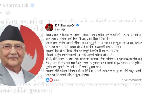 काठमाडौं । प्रजातन्त्र दिवसका अवसरमा एमाले अध्यक्ष केपी शर्मा ओलीले शहीदहरूको योगदान स्मरण गर्दै लोकतान्त्रिक मूल्य र राष्ट्रिय गरिमा जोगाउन…